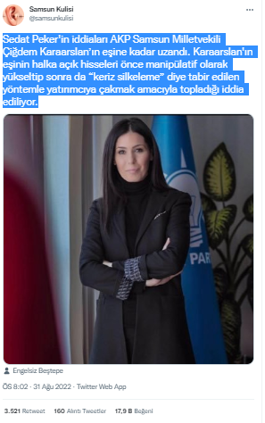 Samsun Kulisi adlı sosyal medya hesabından yapılan paylaşımda, “Sedat Peker’in iddiaları AKP Genel Başkan Yardımcısı ve Samsun Milletvekili Çiğdem Karaaslan’ın eşine kadar uzandı. Karaaslan’ın eşinin halka açık hisseleri önce manipülatif olarak yükseltip sonra da “keriz silkeleme” diye tabir edilen yöntemle yatırımcıya çakmak amacıyla topladığı iddia ediliyor” ifadeleri kullanıldı.