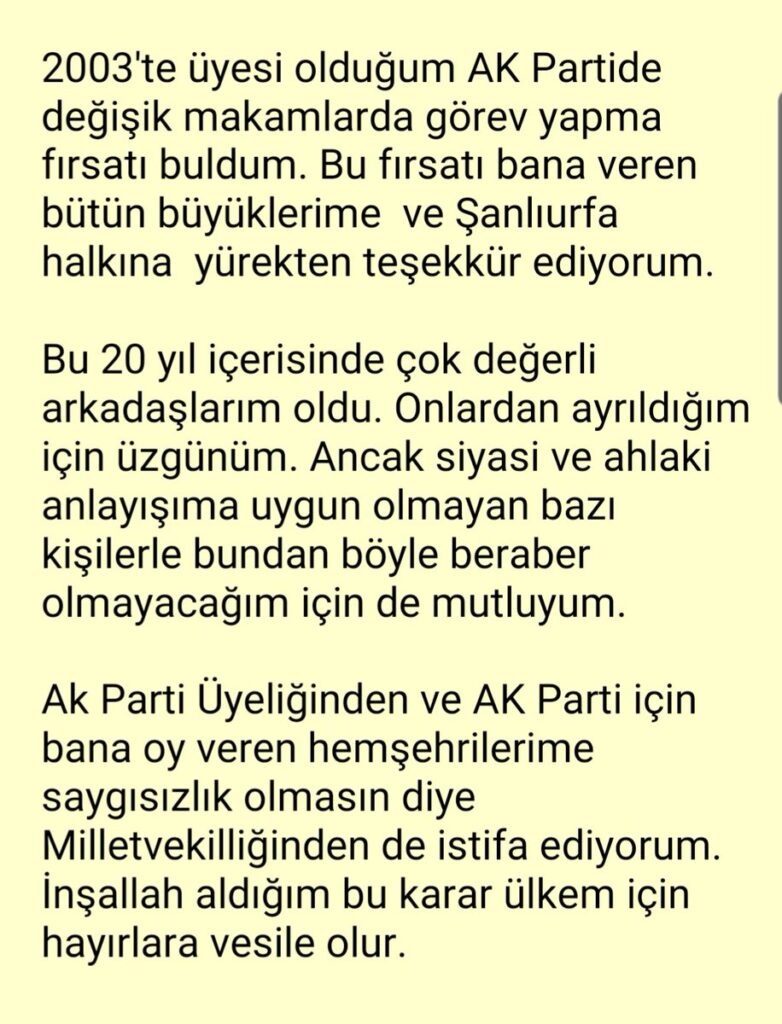 AK Parti Şanlıurfa Milletvekili Ahmet Eşref Fakıbaba, AK Parti üyeliğinden ve milletvekilliğinden istifa etti.