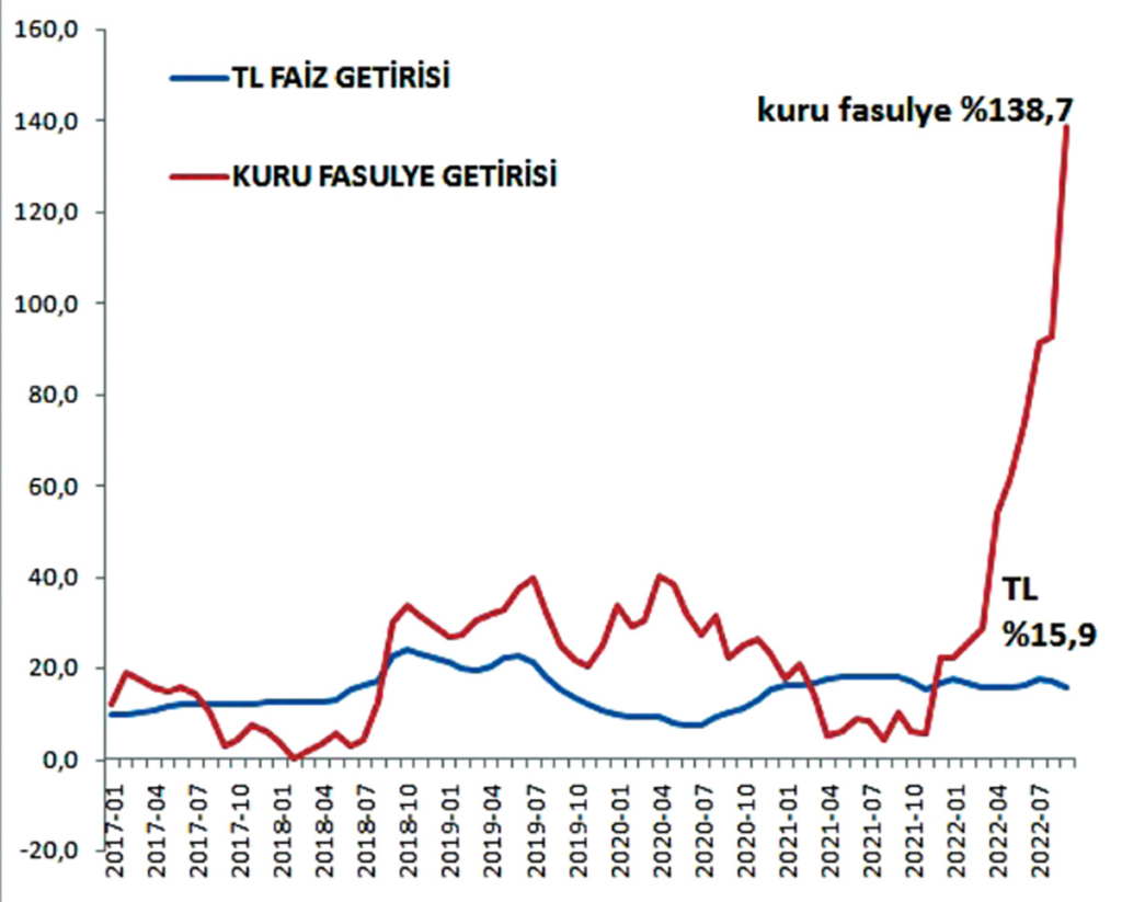 Aşağıda TL mevduat faizi ile kuru fasulyenin fiyat değişimi görülüyor. Son 1 yılda TL yüzde 16 civarı kazandırırken kuru fasulye yüzde 140 artış göstermiş. Tabiri caiz ise TL’den 10 kat daha fazla kazandırmış.