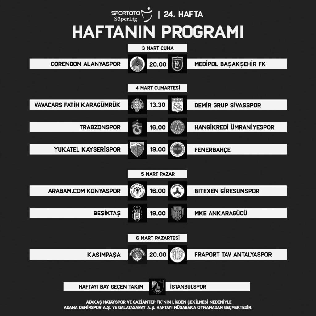 Kahramanmaraş merkezli 11 ili yıkan deprem felaketi sebebiyle ertelenen Süper Lig, 3 Mart Cuma günü Corendon Alanyaspor – Medipol Başakşehir maçıyla yeniden başlayacak.