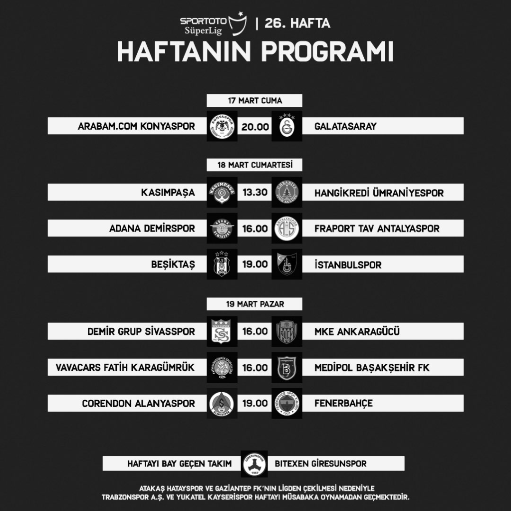 26 Şubat Pazar: 16.00 Ümraniyespor-Adana Demirspor 19.00 Beşiktaş-Antalyaspor