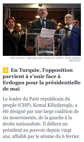 Fransız Le Figaro gazetesi de, “Muhalefet, sonunda seçim için Erdoğan karşısındaki adayını belirledi” başlığına yer verdi.