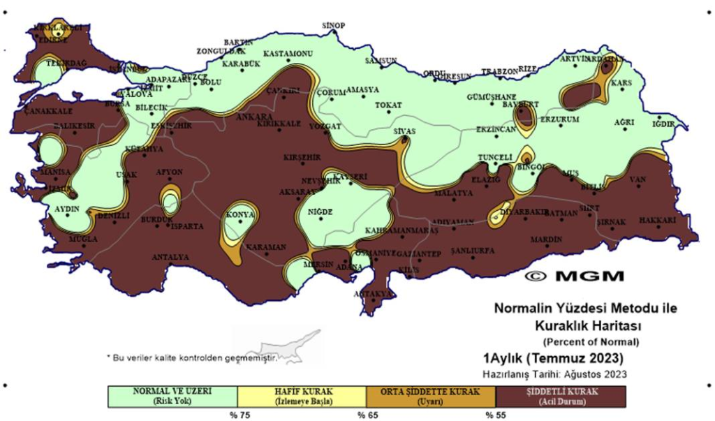 Meteoroloji Genel Müdürlüğü’nün her ay yayımlanan ve kuraklık analizlerinin yapıldığı Normalin Yüzdesi Metoduna (PNI – Percent of Normal Index) Göre 2023 Temmuz Ayı Meteorolojik Kuraklık Durumu’na ilişkin harita korkuttu. Haritada ülkenin büyük bölümünün ‘şiddetli kuraklık’ altında olduğu görülüyor. Haritada, Trakya, Akdeniz, Ege, İç Anadolu ve Güneydoğu Anadolu bölgelerinin çok büyük kısmının ‘şiddetli kuraklık’ yaşadığı görüldü. Karadeniz, İç Ege, Doğu Anadolu’nun kuzeyi ve İç Anadolu’nun güneyinde Niğde ve Konya’da belirli bölgeler ile Batı Marmara’da kuraklık ölçümleri ‘normal ve üzeri’ olarak gösterildi.