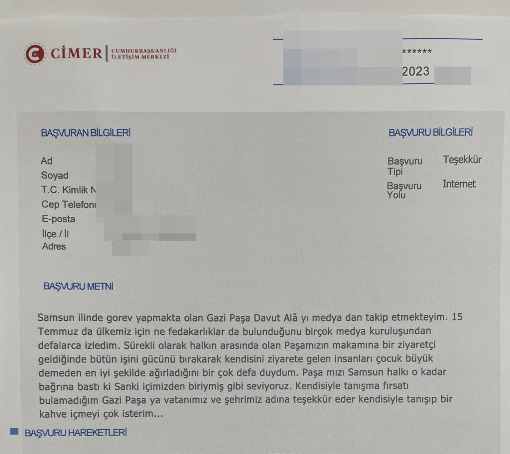 FETÖ’nün 15 Temmuz darbe girişiminde 7 kurşunla vurulmasına rağmen darbecilere İstanbul Kartaltepe Kışlası’nı teslim etmeyen komutan olarak bilinen Samsun Garnizon Komutanı Gazi Tümgeneral Davut Alâ’ya olan sevgi seli CİMER’e yapılan başvurulara da yansıyor.