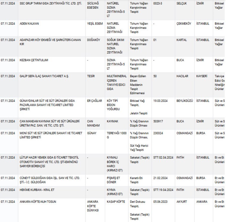 Bakanlığın yayımladığı yeni listeye göre, son yapılan denetimlerde ‘Köy tipi bidon yoğurdu’ olarak satılan üründe ‘bitkisel yağ ve jelatin’ tespit edildi. Ayrıca birçok markanın zeytinyağı ürününde ‘tohum yağlarının karıştırılması’ tespit edildi. Et ürünlerinde ise ‘Sakatat (taşlık)’ ortaya çıktı.
